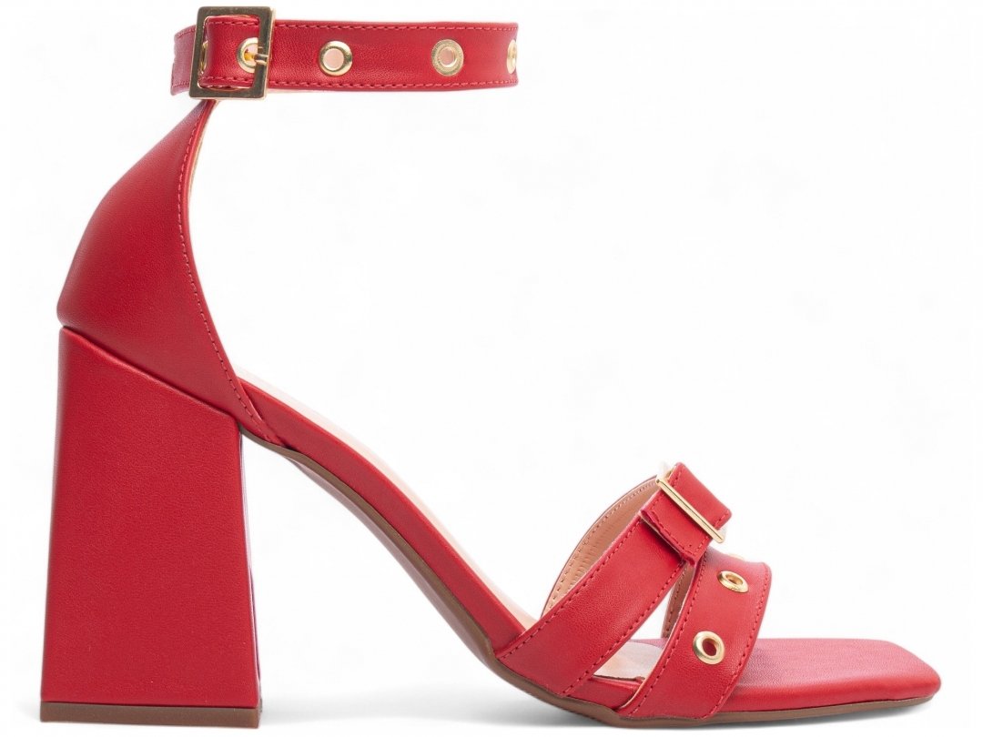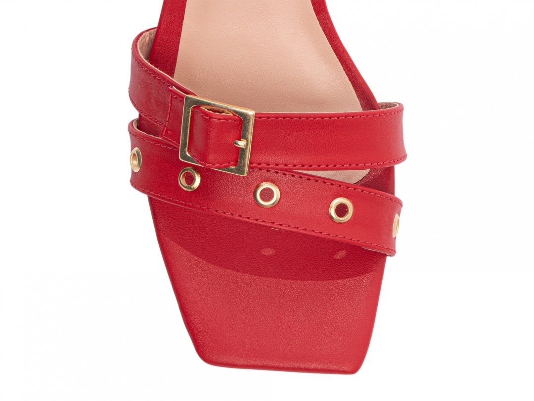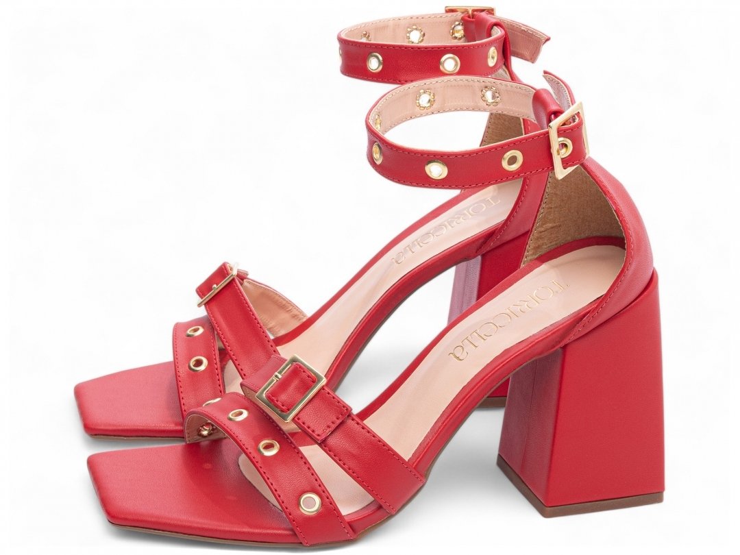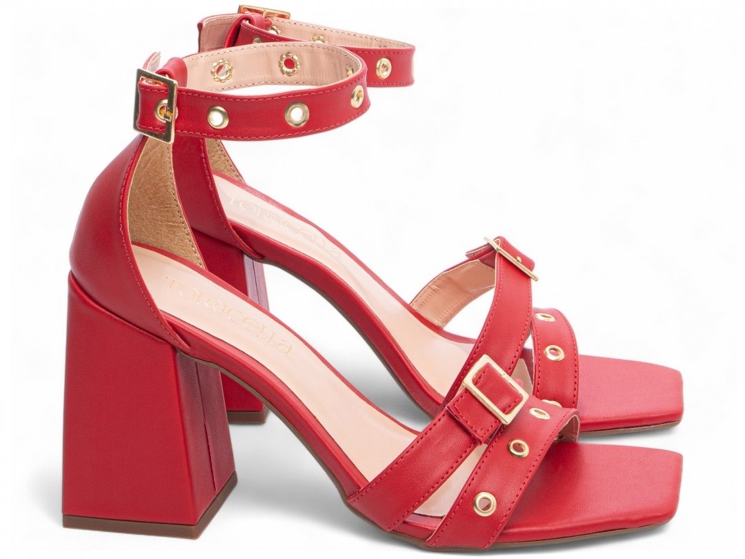 Sandália Feminina Torricella Vermelha com Salto Grosso Dourado. Elegância e conforto em cada passo! A Sandália Feminina Torricella é confeccionada em napa vermelha com detalhes sofisticados em ilhós e fivela dourada, trazendo um toque de luxo ao seu visual. Conta com palmilha macia de 8 mm em EVA revestida em napa, garantindo conforto prolongado. O salto grosso de 9 cm oferece estabilidade e estilo, enquanto o solado antiderrapante na cor bege assegura segurança ao caminhar. Ideal para compor looks modernos e marcantes em qualquer ocasião.